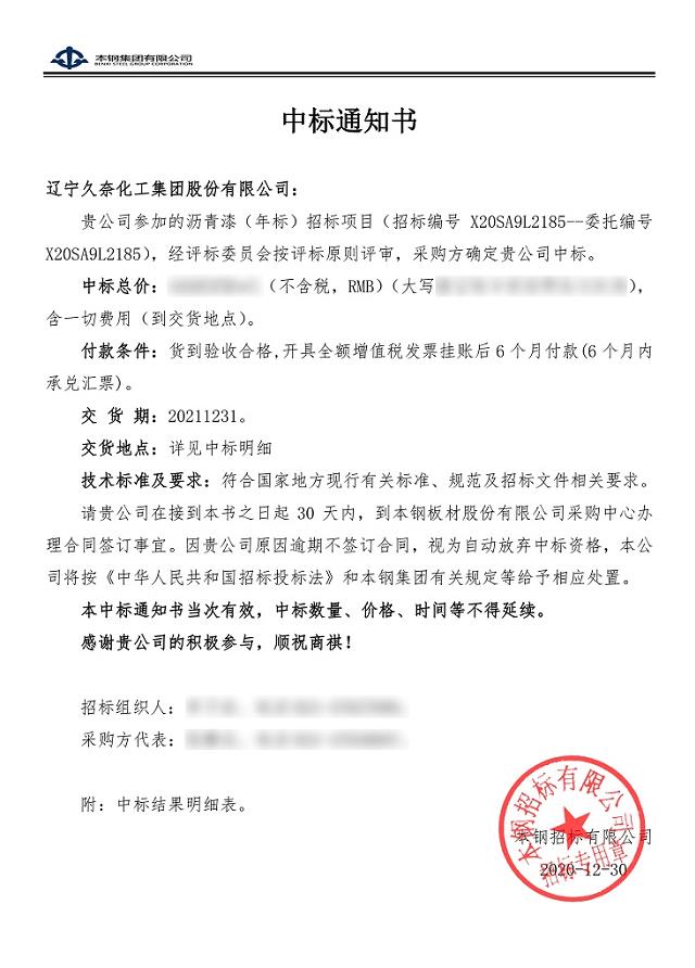 2020年12月30日,遼寧久奈化工集團(tuán)股份有限公司(以下簡稱遼寧久奈化工)收到本鋼集團(tuán)有限公司出具的《中標(biāo)通知書》,瀝青漆年采購訂單。